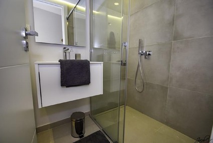 The fourth bedroom/entertainment room, with its own entrance, can function as a recreation space or be transformed into a bedroom with a double bed. Equipped with an en-suite bathroom with shower, toilet, and sink, this bedroom opens directly to the pool area, reflecting the comfort of bedroom 3.